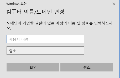 AD 서버의 계정을 넣는 부분입니다. 도메인 가입 권한이 있는 계정을 넣고 확인을 클릭합니다.