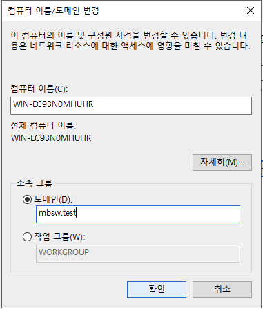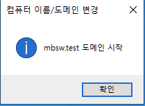도메인 부분에 AD의 도메인을 넣고 "확인" 버튼을 클릭합니다.