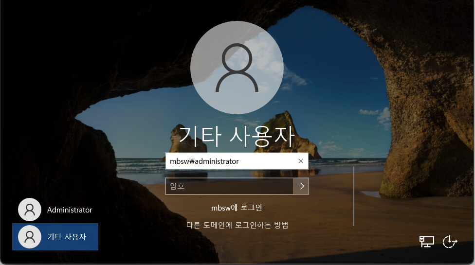AD에 조인하였기 때문에 암호 입력 부분 아래에 제가 배포한 MBSW 도메인을 볼 수 있습니다.