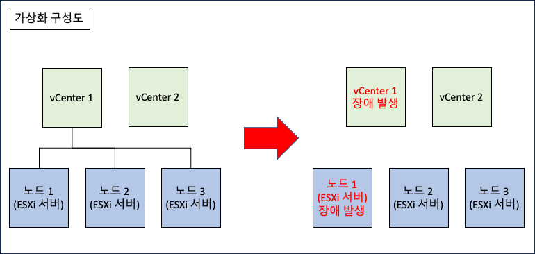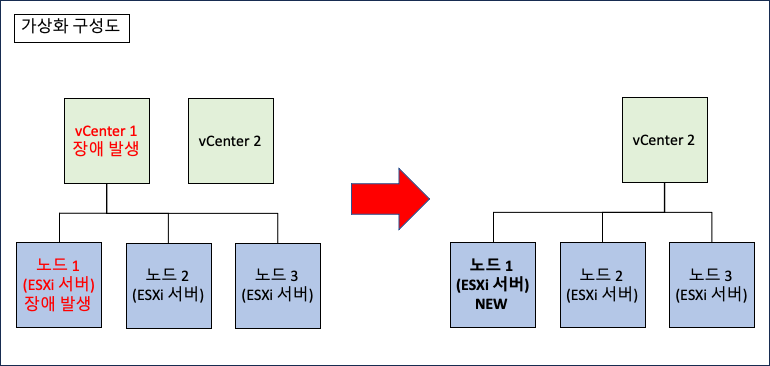이번에 진행할 내용은 노드 3개, 그 중 노드 하나가 장애로 동작하지않으며, vCenter를 vSAN에 마이그레이션하지 않아 노드와 함께 복구가 불가능하여 새로 배포해야하는 상태입니다.