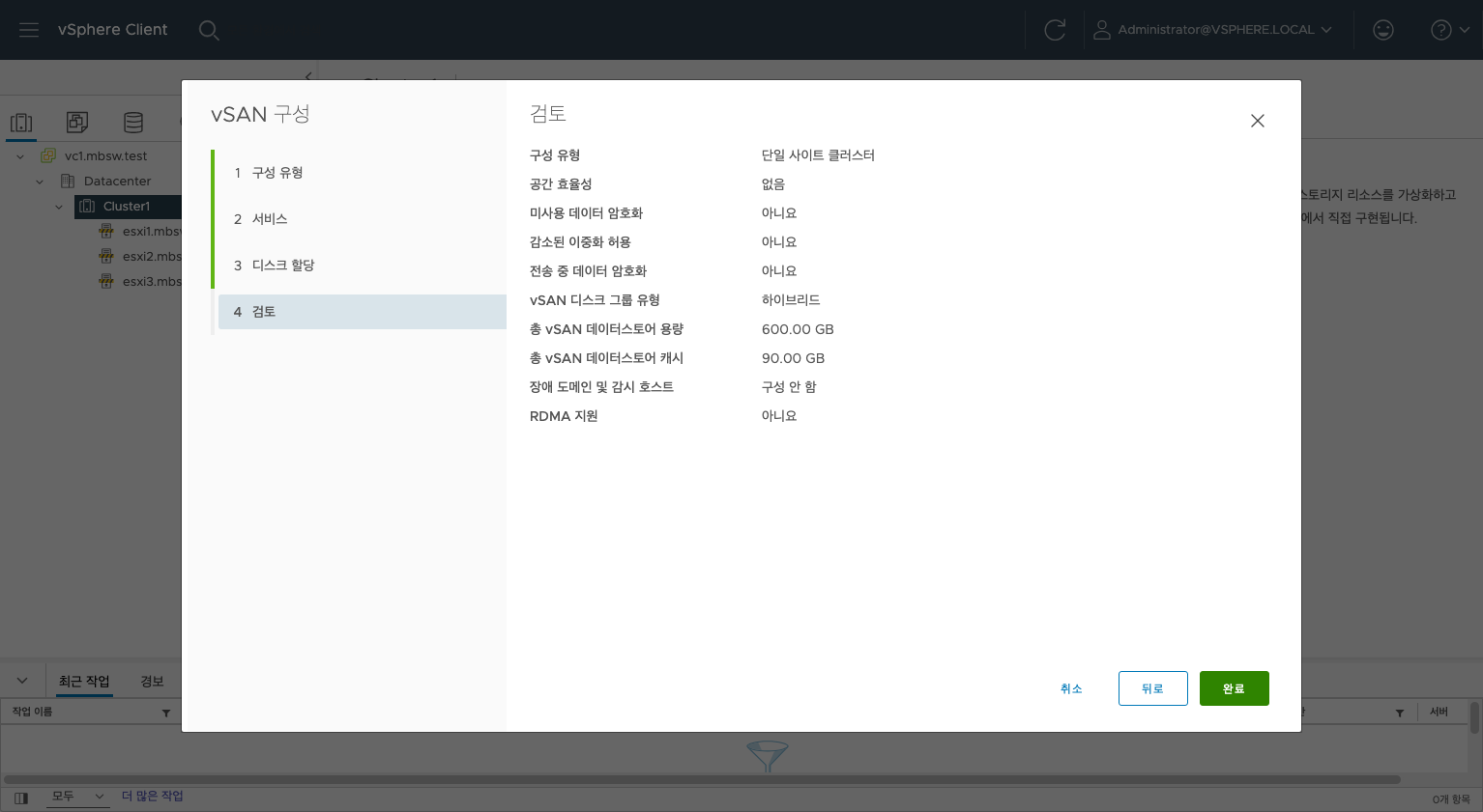 완료를 클릭하여 vSAN을 구성합니다.
