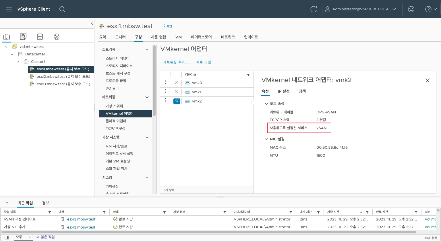 vSAN구성을 위해 vmk를 두개 더 만들고 각각 vmk1(vMotion) vmk2(vSAN)으로 구성합니다.