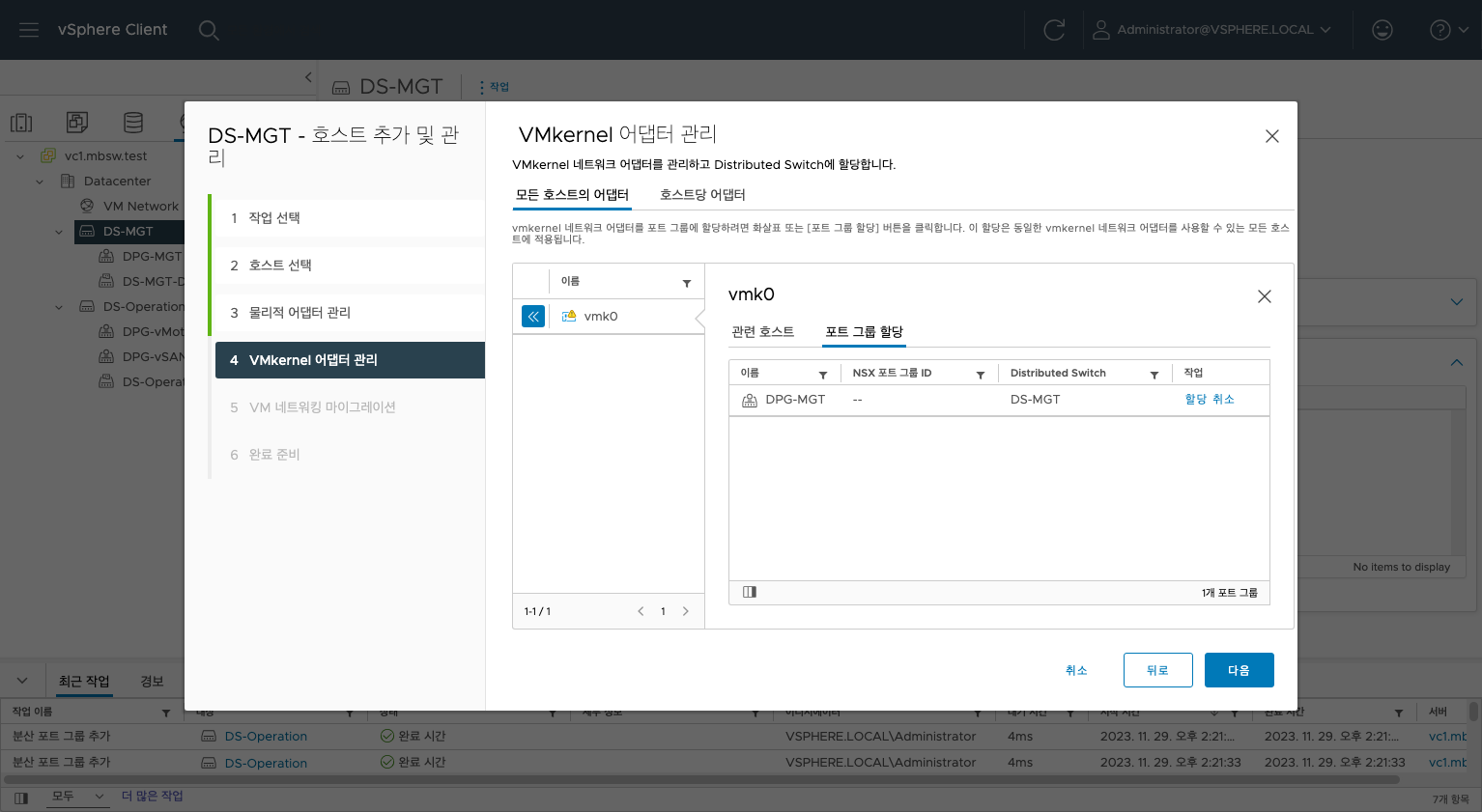 동기화를 완료하고 다음으로 진행할 것은 호스트와 호스트 간 통신을 위한 vmkernel 생성입니다.