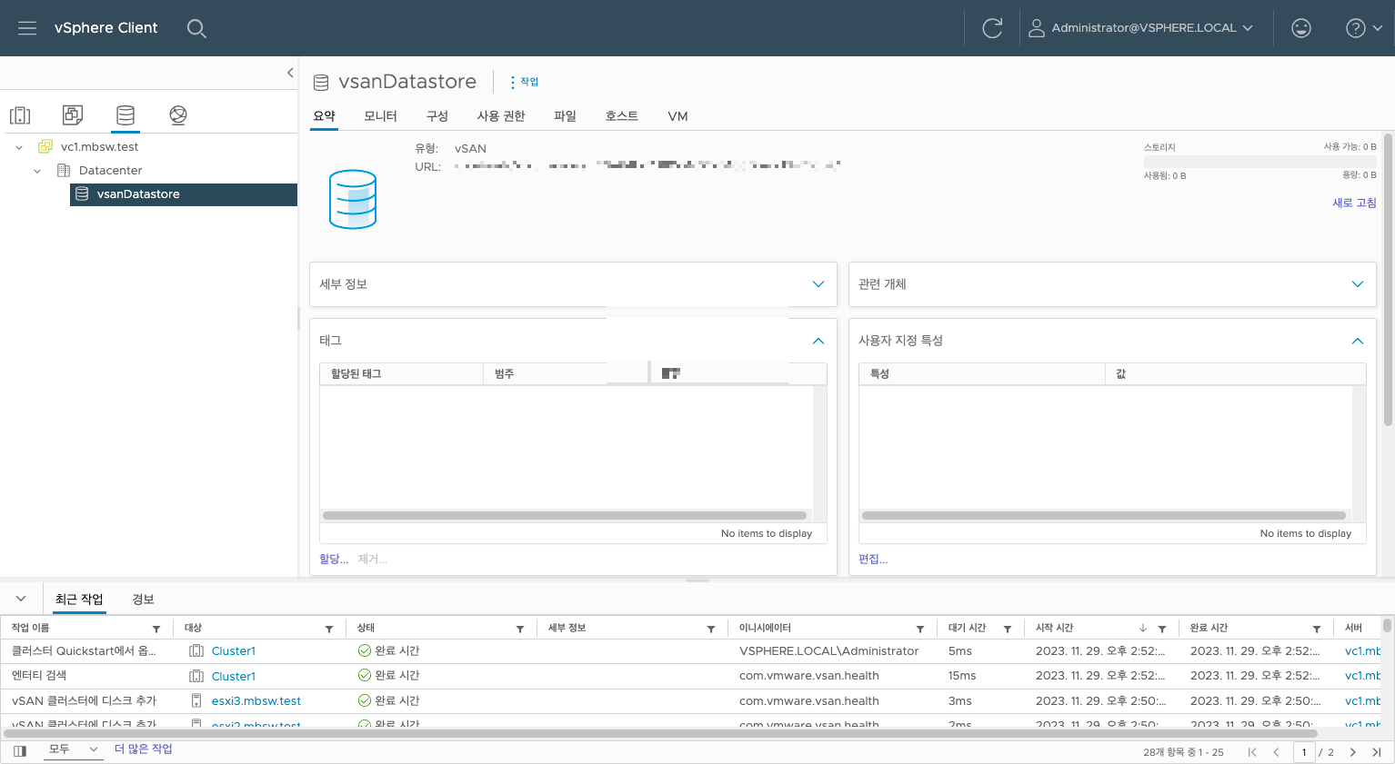 왼쪽 위 인벤토리의 스토리지를 클릭하여 보면 vSANDatastore가 생성된 것을 확인할 수 있습니다.