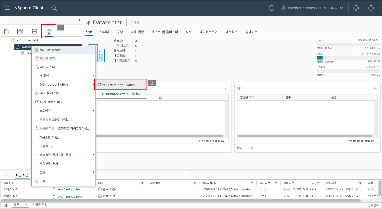 왼쪽 인벤토리의 Networking 클릭 -> Datacenter 우클릭 -> Distributed Switch 확장 -> 새 Distributed Switch 클릭