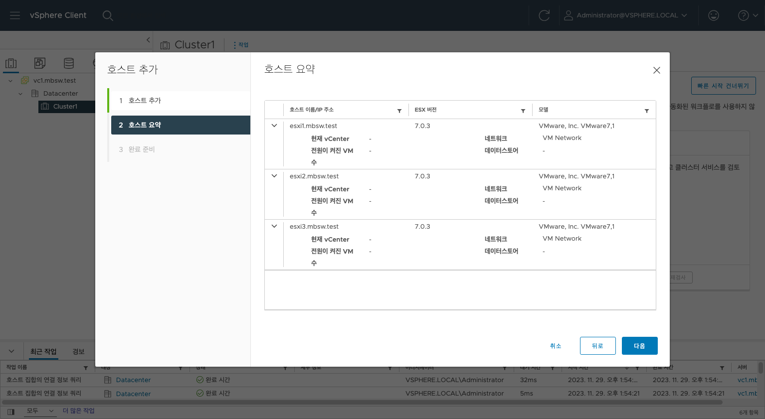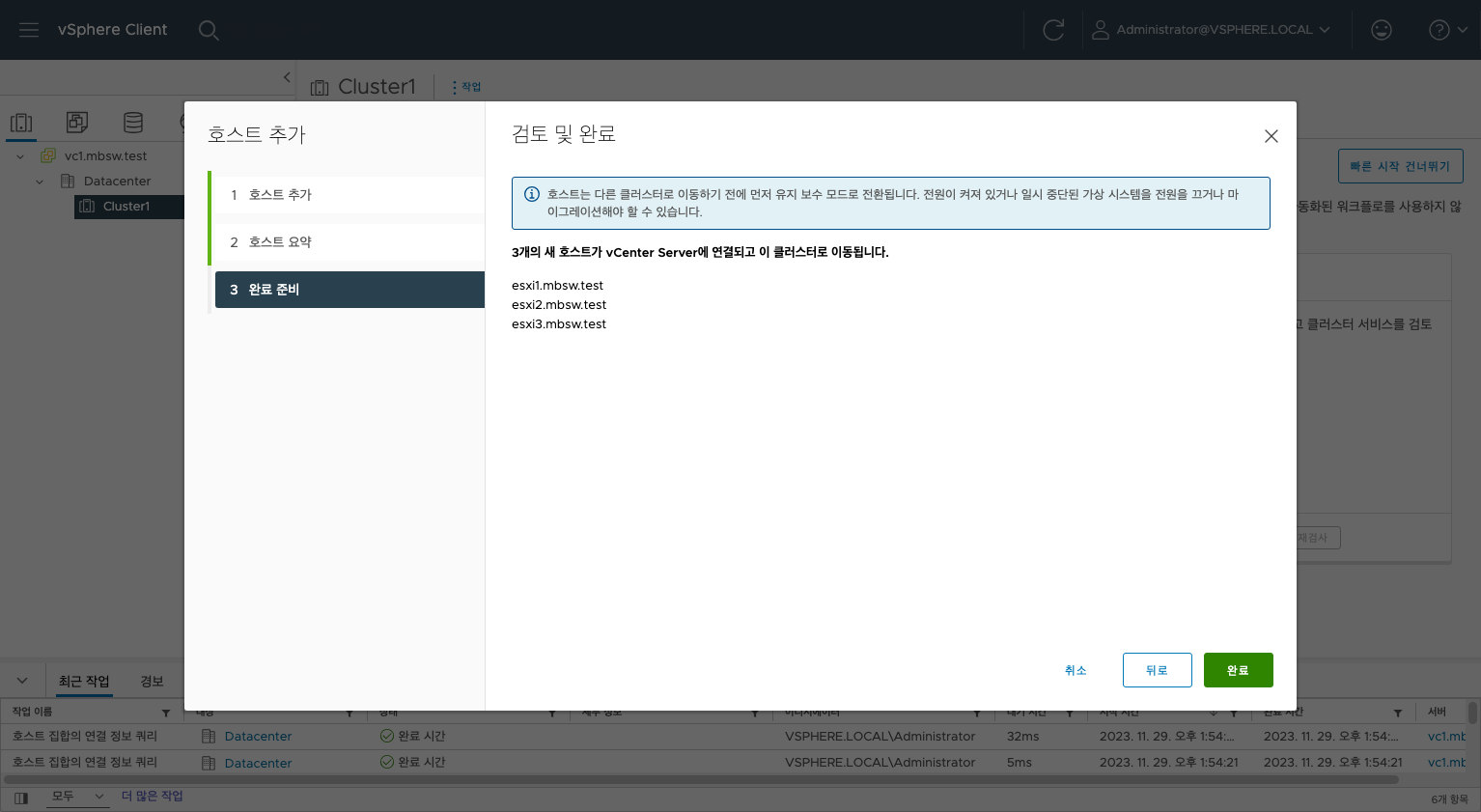 완료를 클릭하면 자동으로 호스트를 클러스터에 넣어 추가합니다.