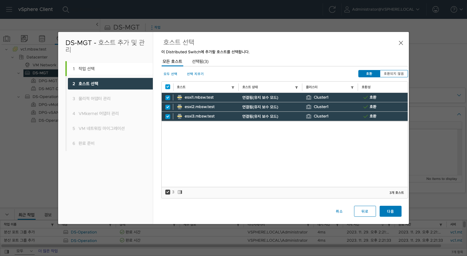 바로 vDS에 호스트를 추가합니다.