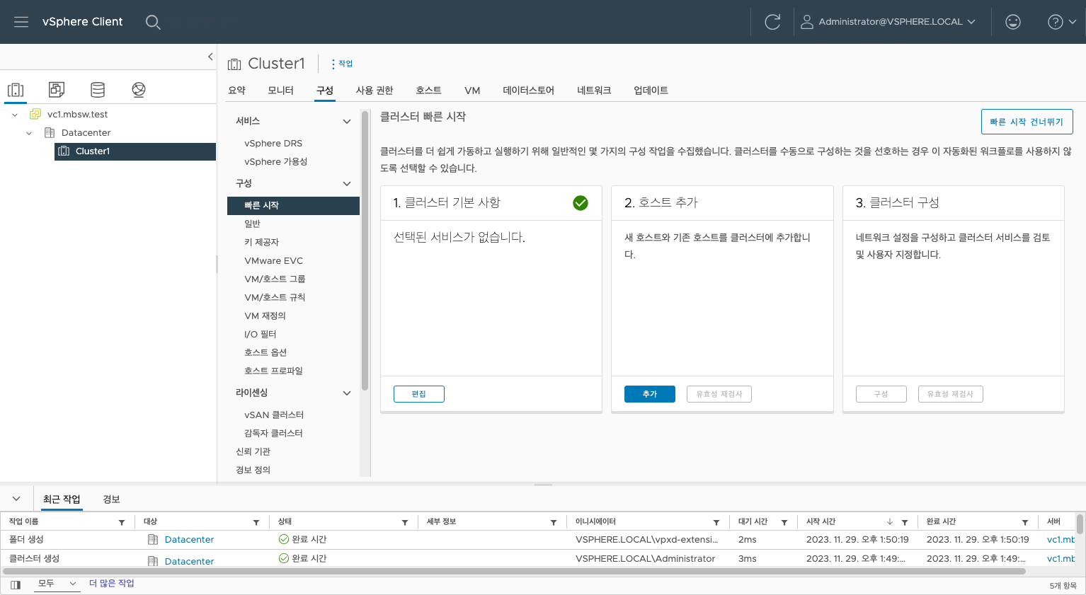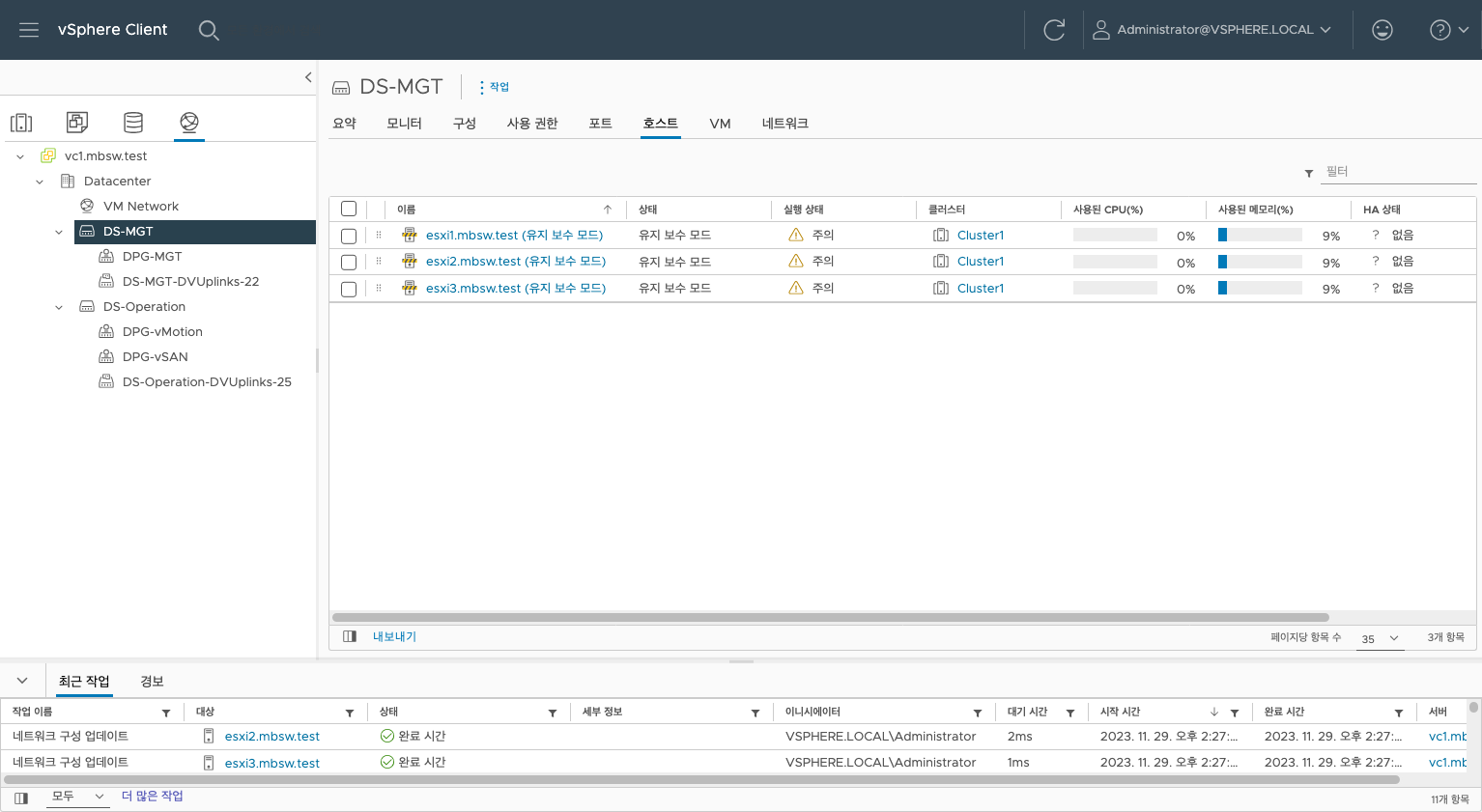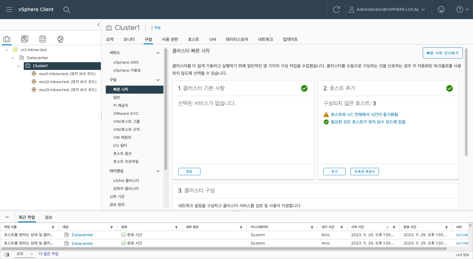 네트워크 구성이 완료되었습니다. 이제 클러스터로 넘어가 vSAN을 구성하겠습니다.