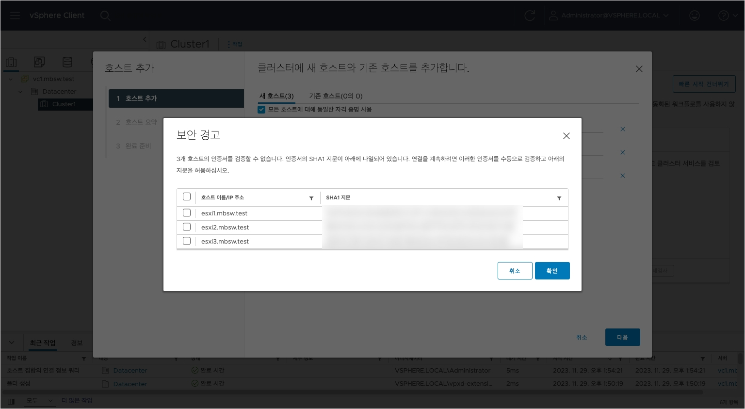 클러스터를 우클릭하여 호스트 추가 시 동일한 자격증명을 활용하여 한번에 여러 대의 호스트를 추가할 수 있습니다.