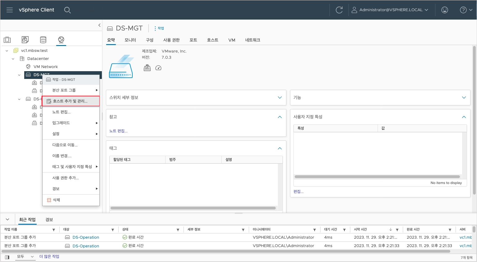 vDS 우클릭 -> 호스트 추가 및 관리 를 클릭합니다.