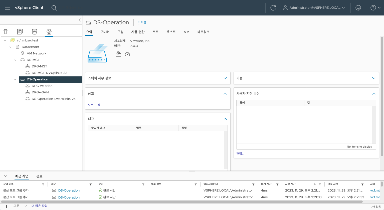 두 개의 DS로 구성했습니다. 하나는 내부 네트워크용, 다른 하나는 vMotion과 vSAN 용
