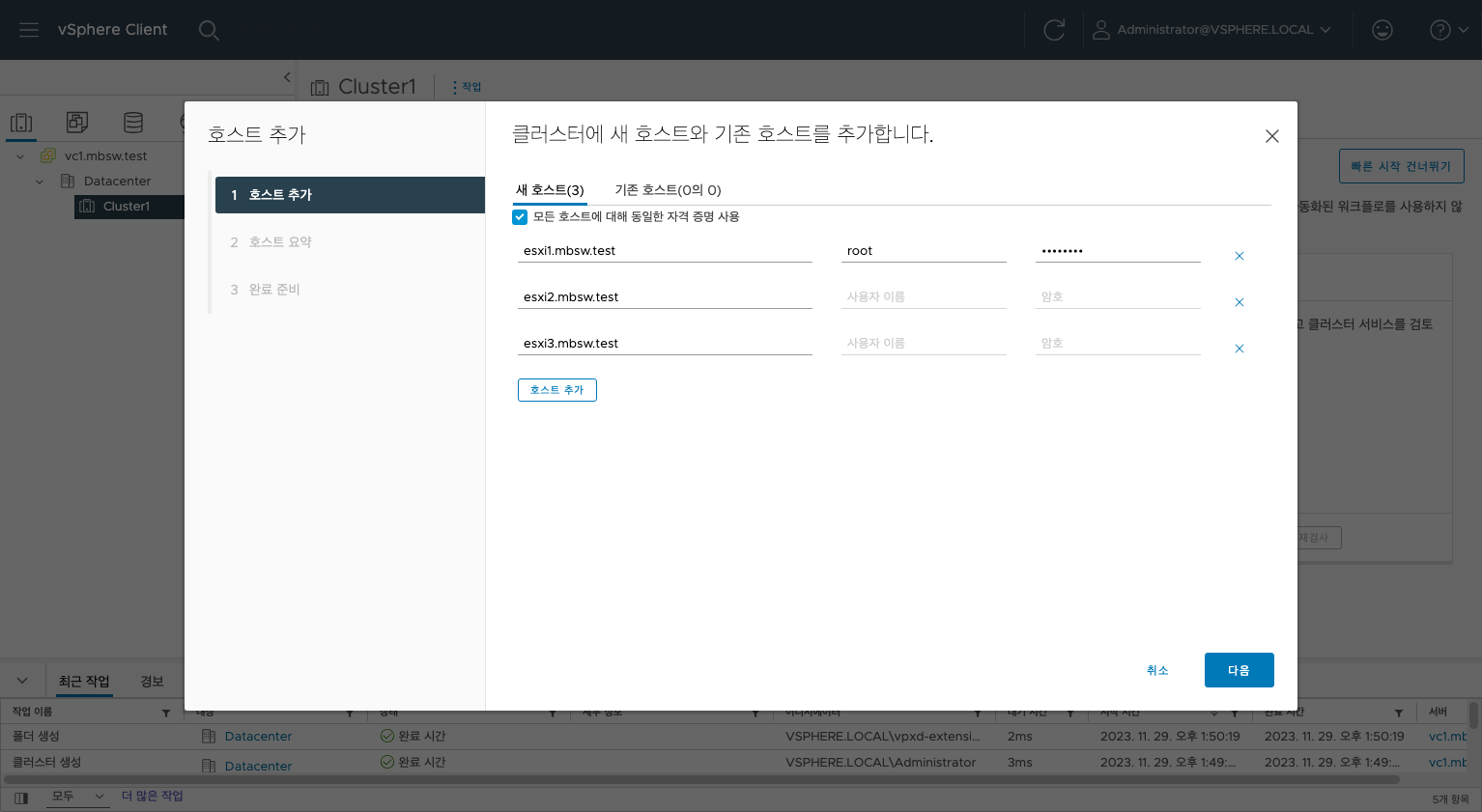 클러스터를 우클릭하여 호스트 추가 시 동일한 자격증명을 활용하여 한번에 여러 대의 호스트를 추가할 수 있습니다.